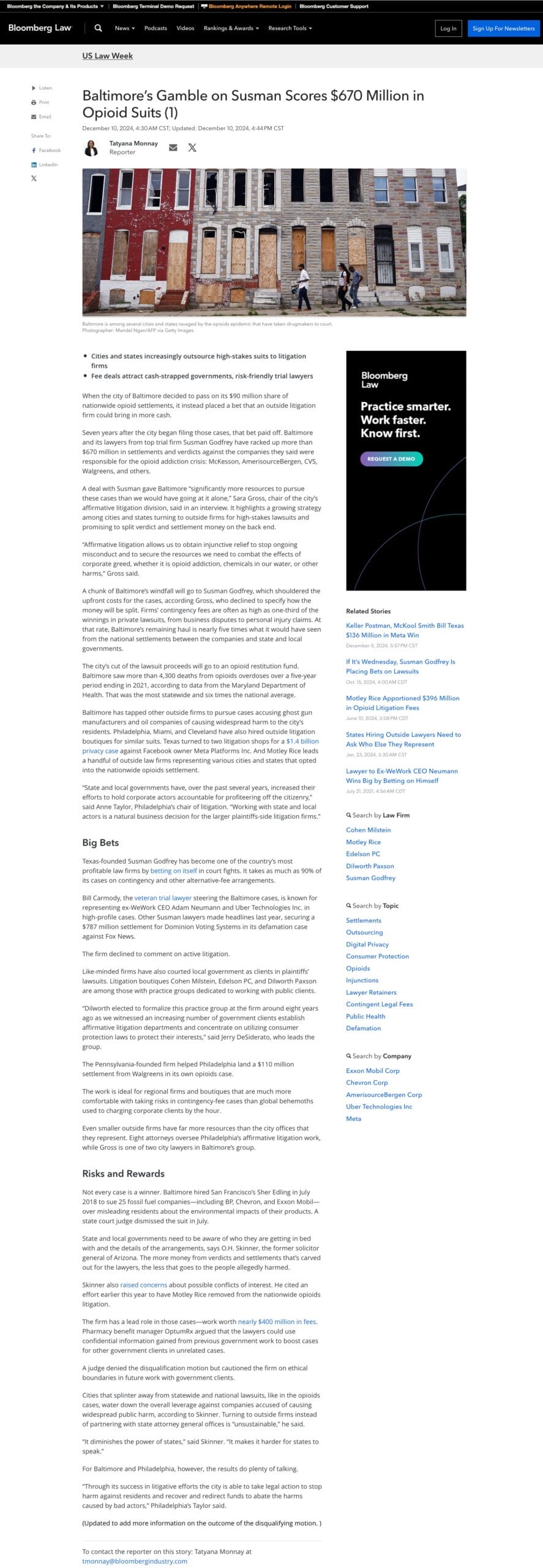 - ^ Monnay, Tatyana (2024-12-10). "Baltimore's Gamble on Susman Scores $670 Million in Opioid Suits". Bloomberg Law. Retrieved 2026-02-13.