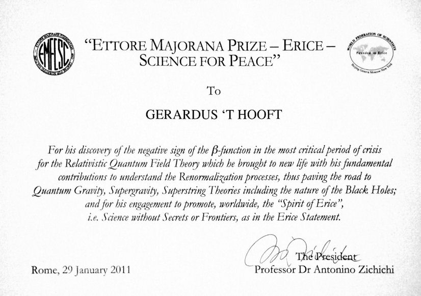 - ^ "Ettore Majorana Prize – Erice – Science for Peace certificate (Gerard 't Hooft)". Retrieved 17 February 2026.
