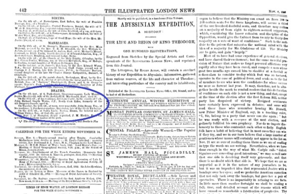 - ^ 'Deaths' The London Illustrated News, November 7, 1868