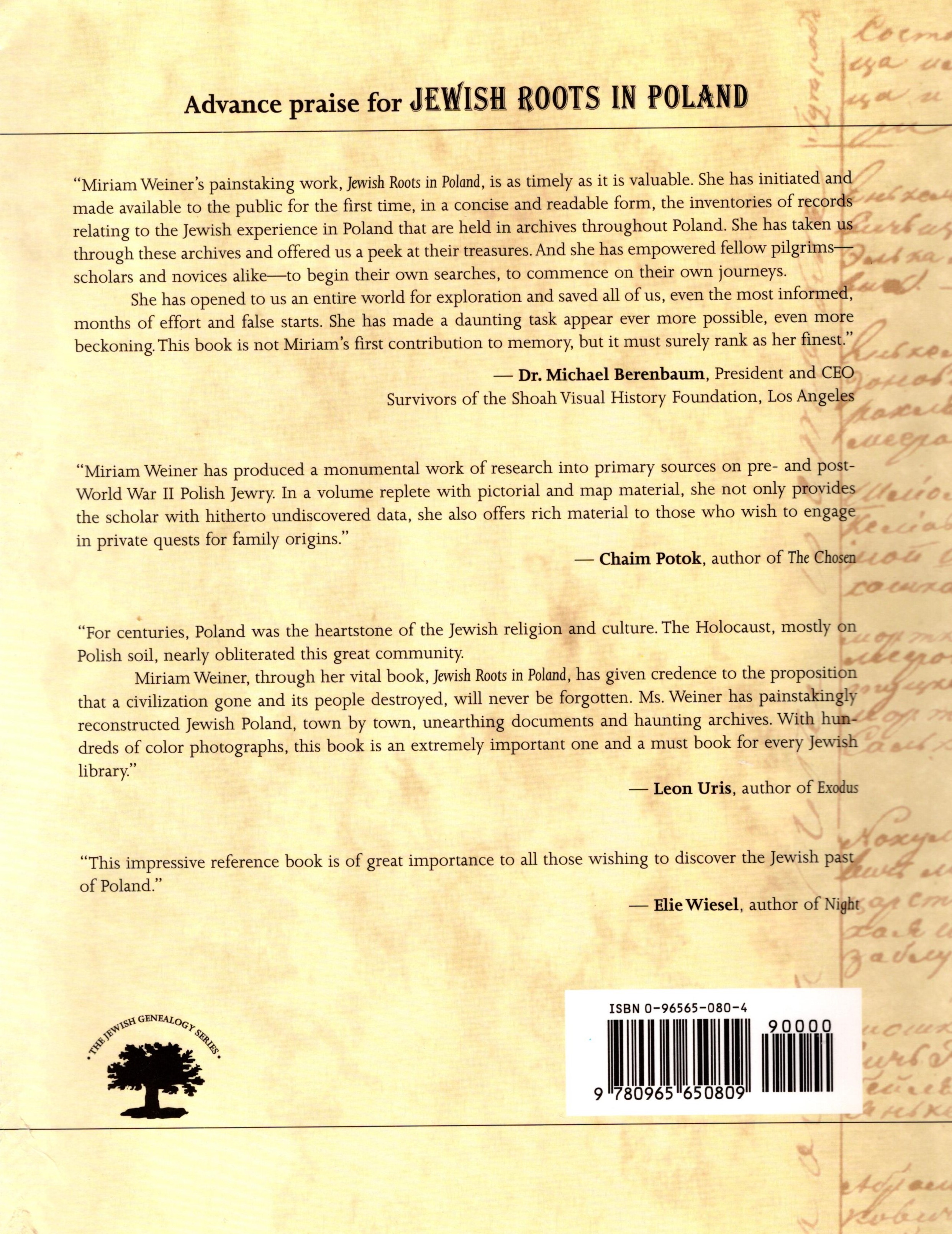 - Chaim Potok (author of "The Chosen") who said: "Miriam Weiner has produced a monumental work of research into primary sources on pre- and post-World War II Polish Jewry. In a volume replete with pictorial and map material, she not only provides the scholar with hitherto undiscovered data, she also offers richmaterial to those who wish to engage in private quests for family origins."[43]