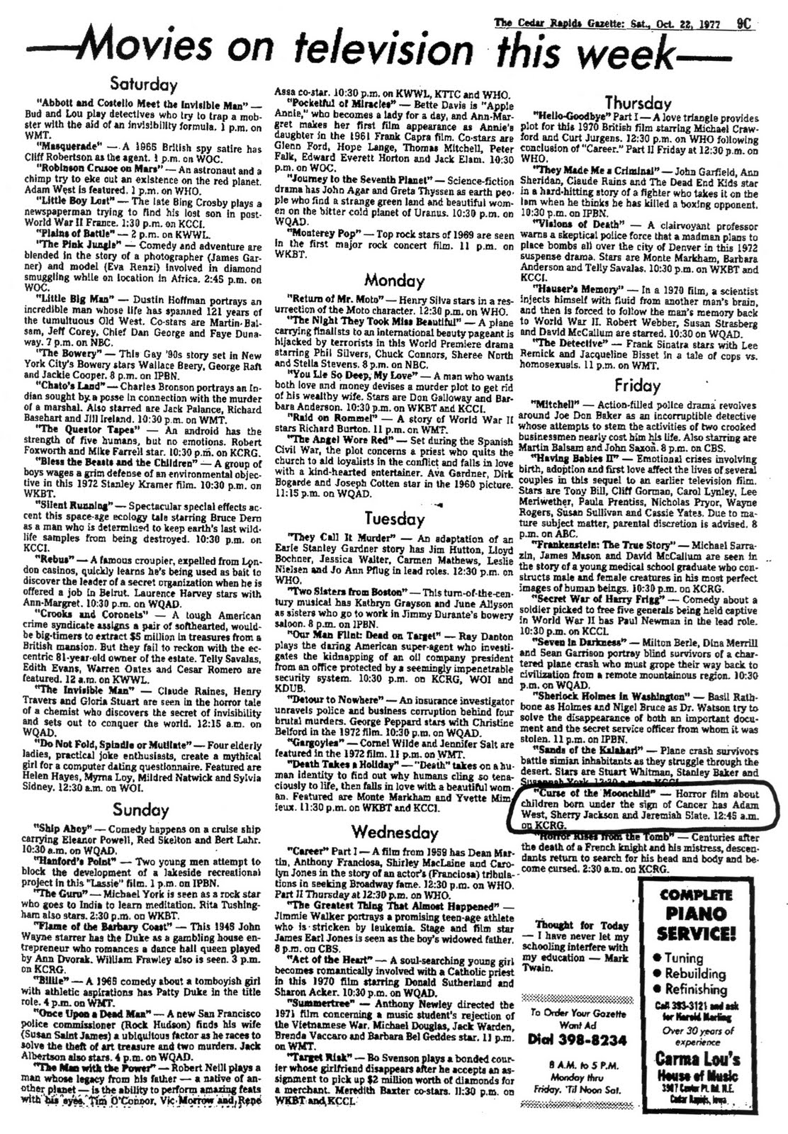- ^ "Movies on television this week". The Cedar Rapids Gazette. October 22, 1977. p. 9C. Retrieved September 12, 2023.