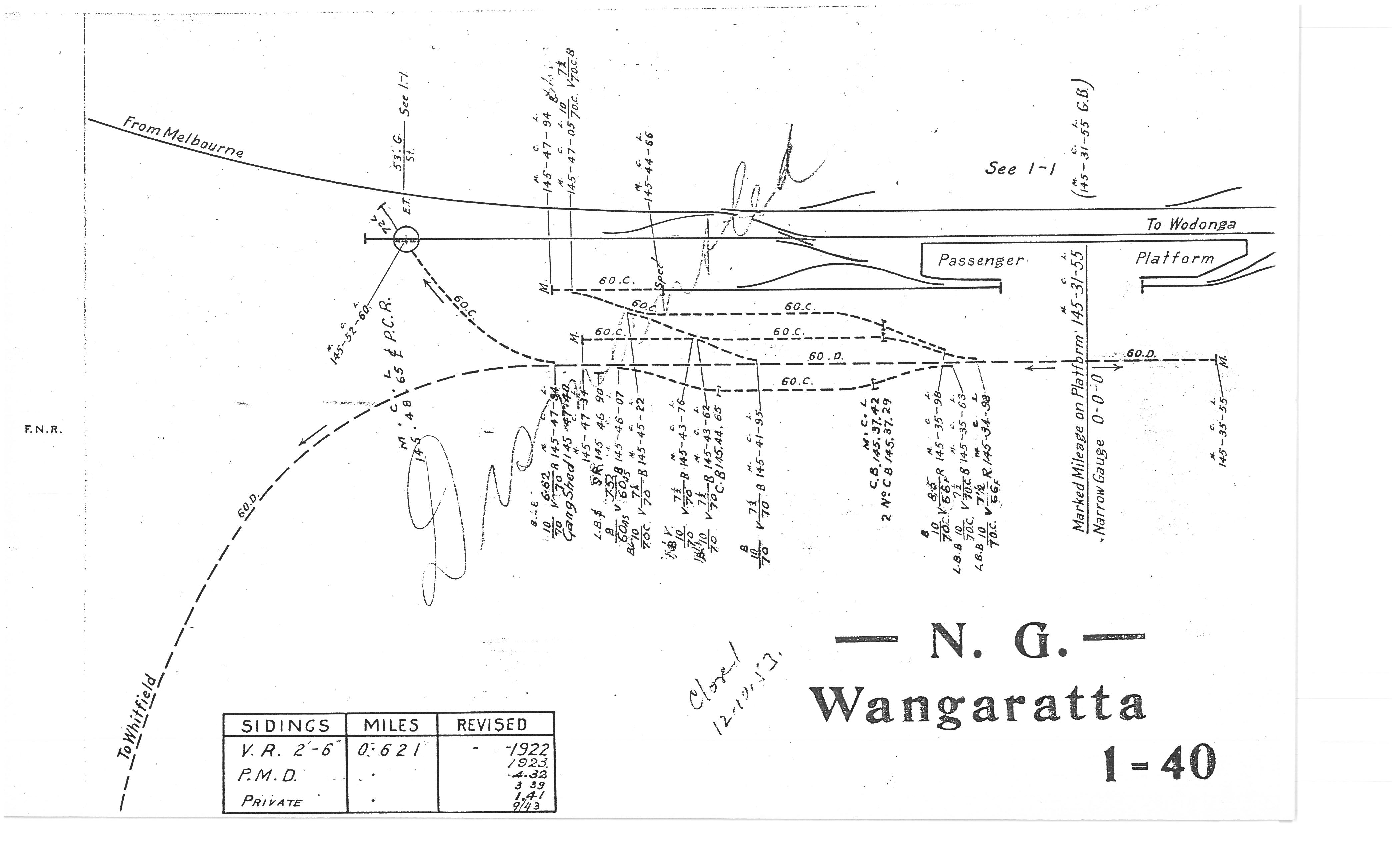 - ^ a b c Victorian Railways (n.d.). Line Diagram – N.G. Wangaratta (Line Diagram). Bau, M. Retrieved 8 January 2026.